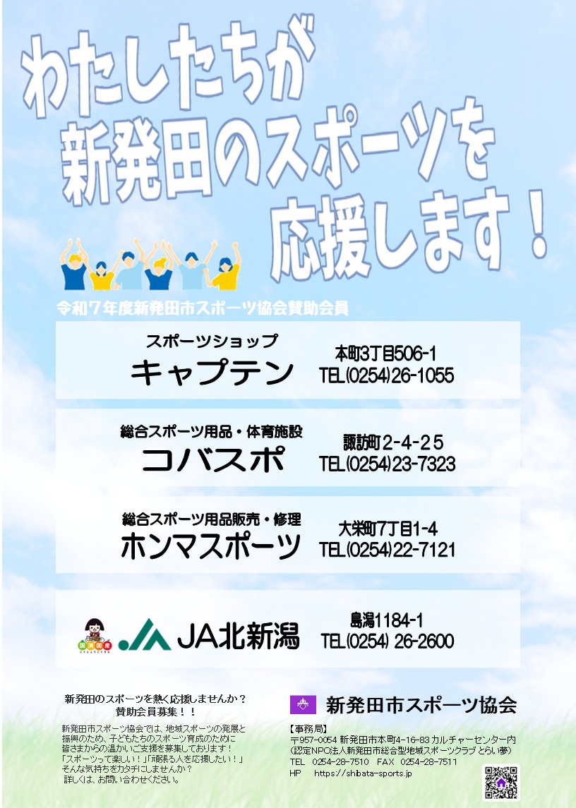 当協会では、生涯スポーツの推進と青少年の健全な発達に努めることを目的に様々な事業を行っておりますが、その中でも、新発田市における青少年スポーツの更なる競技力向上のため、賛助会員を募集し、頂戴した賛助会費を新発田市スポーツ少年団の活動費に充て支援しております。