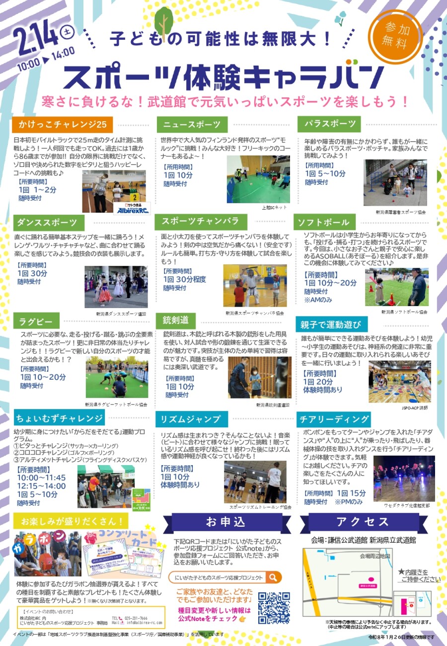 スポーツ体験キャラバン(新潟県スポーツ協会主催)の第4回目を、2月14日(土)に「謙信公武道館」で開催します。