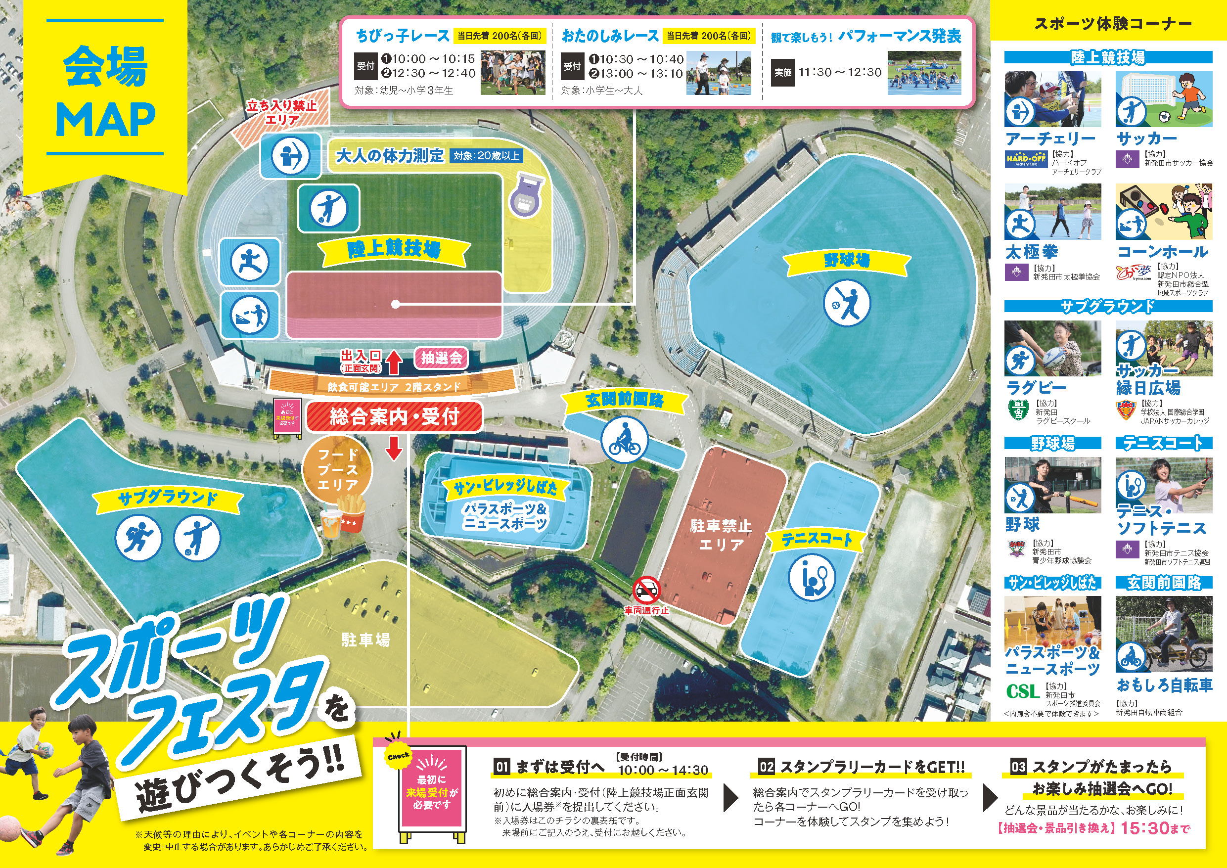 五十公野公園陸上競技場、五十公野公園野球場、五十公野公園テニスコート、サン・ビレッジしばたを使用して以下のようなコーナーの実施を予定しています。