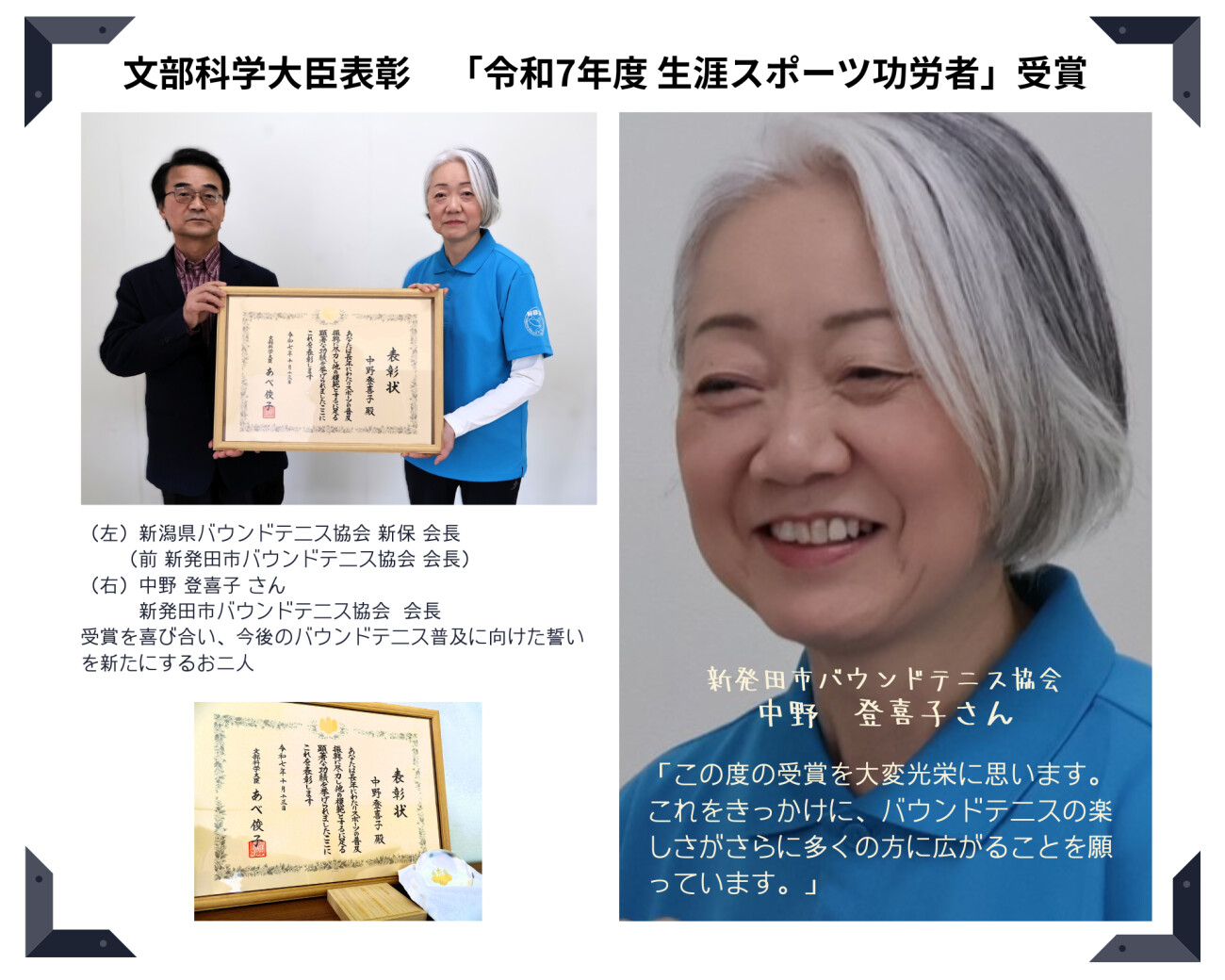 この度、地域スポーツの振興に顕著な成果をあげた個人及び団体を表彰する「令和7年度 生涯スポーツ功労者及び生涯スポーツ優良団体表彰」(文部科学大臣表彰)において、新潟県候補者の中から、新発田市バウンドテニス協会 の 中野 登喜子 さんが受賞されました。